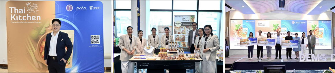 นอกจากนี้ ยังมีอีก 7 นวัตกรรมอาหาร ที่เข้าร่วม "โครงการ Thai Kitchen : Crafted FoodTech Accelerator Program" ได้แก่ Chiwadi - Fruii Coconut Gummies เยลลี่น้ำมะพร้าวฟังก์ชันดัชนีน้ำตาลต่ำ เคี้ยวเพลินจากธรรมชาติ 100% ไม่มีสารกันเสีย ไม่เพิ่มน้ำตาล ตอบโจทย์กลุ่มคนรักสุขภาพที่กำลังเติบโต และเจาะตลาดเวลเนสมูลค่าสูงด้วยผลิตภัณฑ์คลีนเลเบล Khemkon Foods – PlantKraprow ซอสกะเพราเข้มข้นพร้อมใช้ และกะเพราวีแกนไทยแท้รสดั้งเดิมพร้อมทาน เหมาะสำหรับร้านอาหาร โรงครัวกลาง (Quick Service Restaurant - QSR) และการส่งออก นำเสนอรสชาติไทยแท้แบบวีแกนสู่ตลาดอาหารโลก AVAGAN - Plant-Based Cheese ผู้บุกเบิกชีสแพลนต์เบสจากเมล็ดมะม่วงหิมพานต์และถั่วเหลือง เนื้อนุ่ม กลมกล่อม ละลายได้ ไร้แลคโตส ไร้คอเลสเตอรอล เหมาะสำหรับคนรักสุขภาพและผู้บริโภคที่แพ้แลคโตส SWP - Molkham Tamarind Paste น้ำมะขามเปียกเข้มข้น รสเปรี้ยวไทยแท้ ผ่านกระบวนการ Low-Temp ยืดอายุ คงกลิ่นหอมและคุณค่าทางโภชนาการเสมือนเก็บสดจากต้น เก็บได้นาน มาตรฐาน HACCP/GMP ASI - Starry Snacks ผลไม้อบแห้งและขนมไทยฟรีซดราย รสชาติแท้ เก็บได้นาน พร้อมส่งออก คงรสชาติและความหอมด้วยเทคโนโลยีฟรีซดรายพิเศษ เช่น ข้าวเหนียวมะม่วงและผลไม้กรอบ พร้อมรับผลิต OEM Plant Origin - Exx Egg Replacer ผงทดแทนไข่จากรำข้าวไฮโดรไลซ์ โปรตีนย่อยง่ายสำหรับสายคลีน ทดแทนไข่ ทำอาหารได้หลากหลายชนิด ปราศจากสารก่อภูมิแพ้ เหมาะสำหรับการทำเบเกอรี่และอาหารสำหรับผู้สูงอายุ และ Foodle Noodle - Thai Rice Noodles เส้นข้าวไทยสูตรที่มีค่าดัชนีน้ำตาลต่ำ ใยอาหารสูง โปรตีนจากพืช จากข้าวไทย 100% ฉลากสะอาด (Clean Label) ปราศจากกลูเตน ส่งออกได้ทั่วโลก เหมาะกับตลาดสุขภาพ
